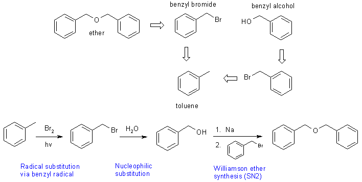 A Williamson ether synthesis requires and alkoxide and an alkyl halide. In this case, it is necessary to make the alcohol from the halide by a simple substitution since the halide can be obtained from the toluene via a radical subtituion. The retrosynthesis and the synthesis are shown below: